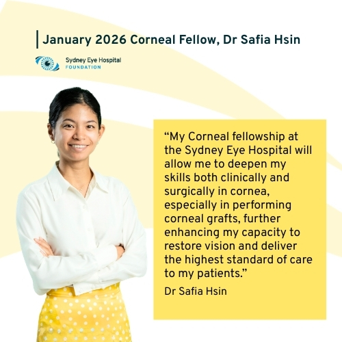 We’re delighted to welcome Dr Safia Hsin to Sydney Eye Hospital as our Corneal Fellow. This highly sought-after Fellowship opportunity is made possible through the support of our generous donors and the Sydney Eye Hospital Foundation Fellowship Program.